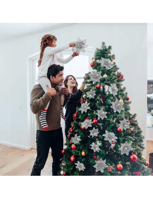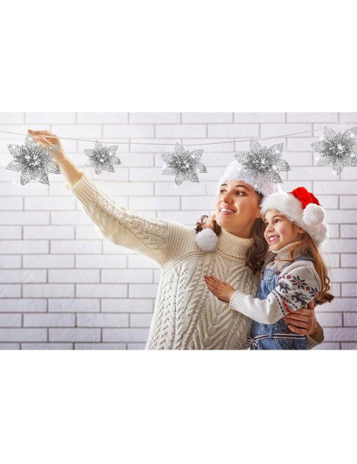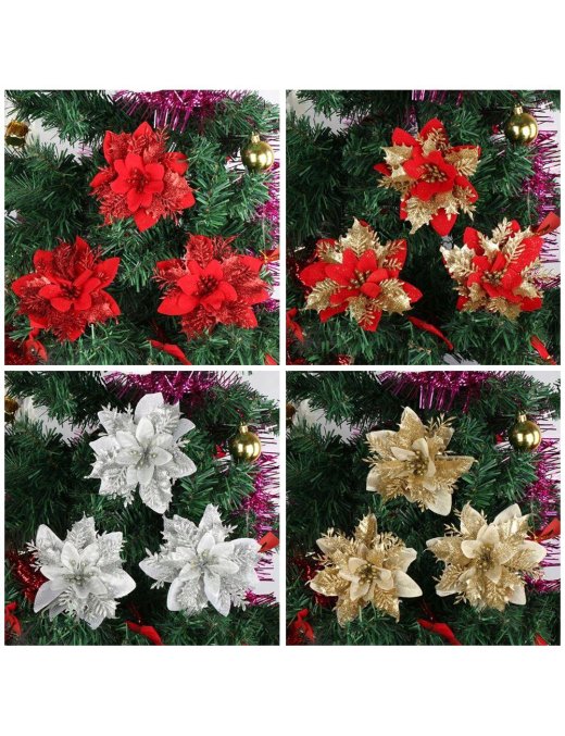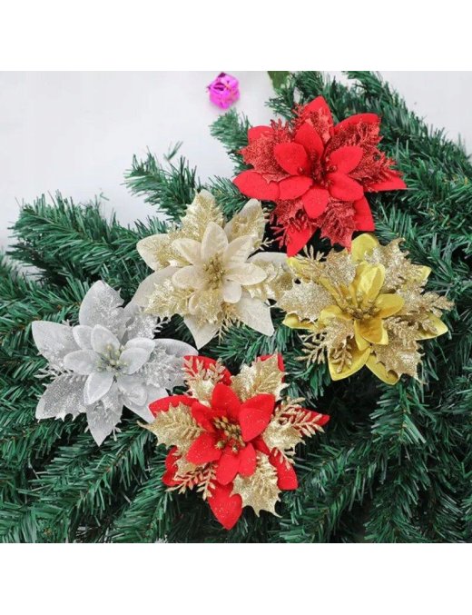 Zestaw zawiera 12 błyszczące sztuczne kwiaty pierwszego gatunku w kolorze czerwone i 12 uniwersalne gałązki kwiatowe o długości 14cm, które zaspokoją Twoje potrzeby związane z dekoracjami bożonarodzeniowymi.