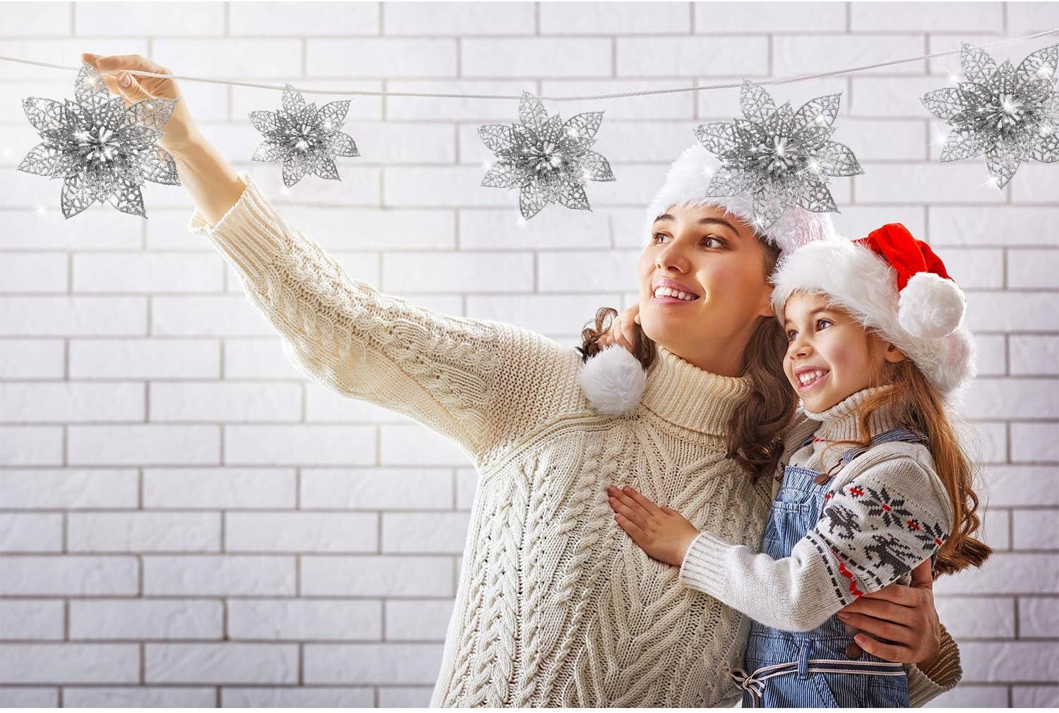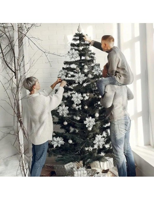 Połącz srebro z białymi lampkami i bombkami „frosted”. W girlandzie układaj kwiaty co 25–30 cm, a pojedynczymi sztukami ozdabiaj prezenty pod choinką.