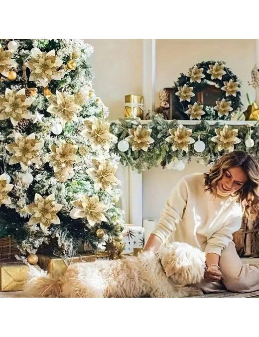 Szukasz szybkiej i efektownej dekoracji na święta? Zestaw 12 złotych kwiatów – gwiazd betlejemskich – to klasyka w odsłonie glamour. Lekkie, połyskujące i wygodne w montażu dzięki klipsom w komplecie. Idealne na choinkę, stroiki, wieńce, girlandy, prezenty oraz jako akcent stołu świątecznego.