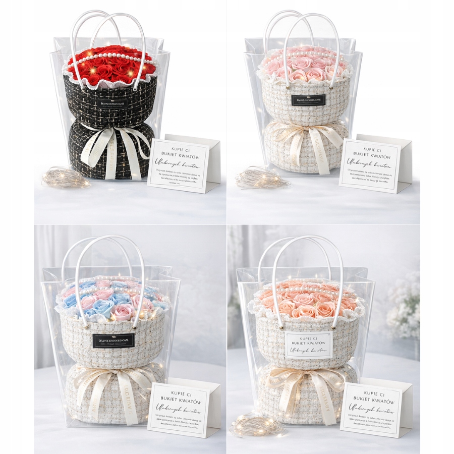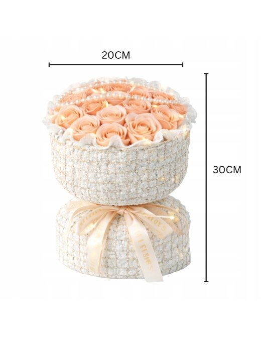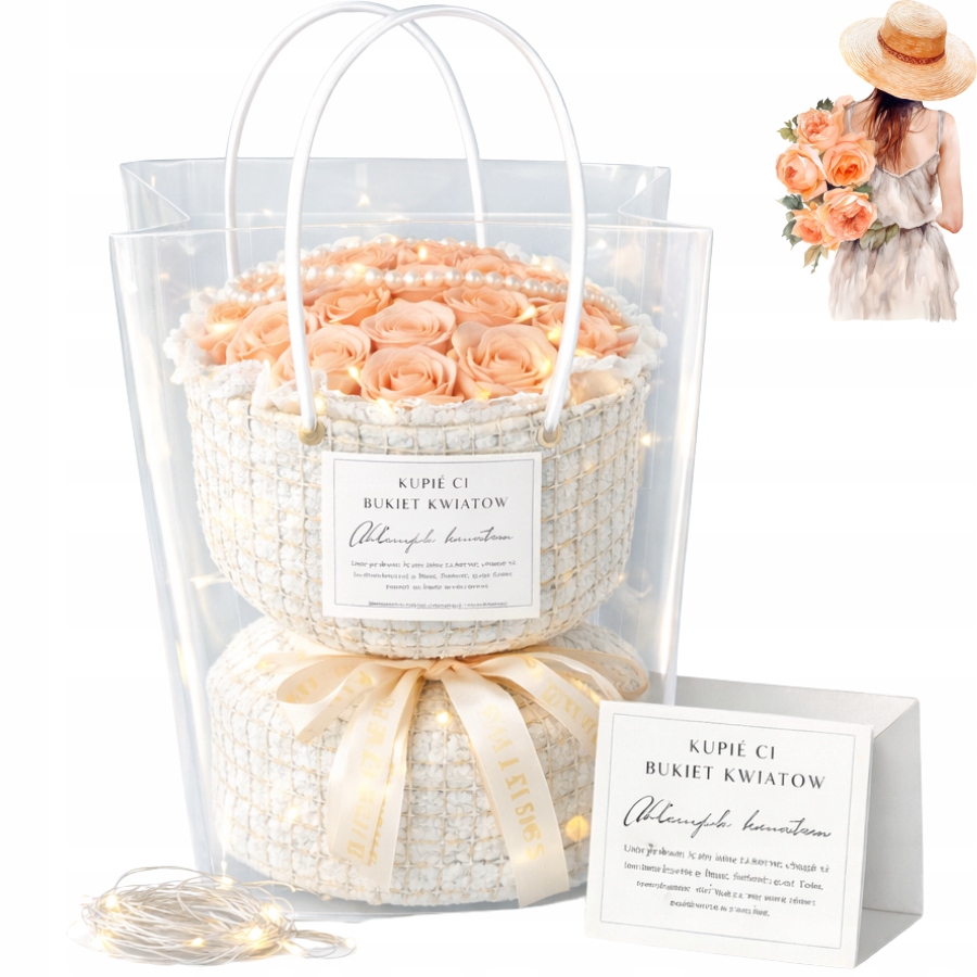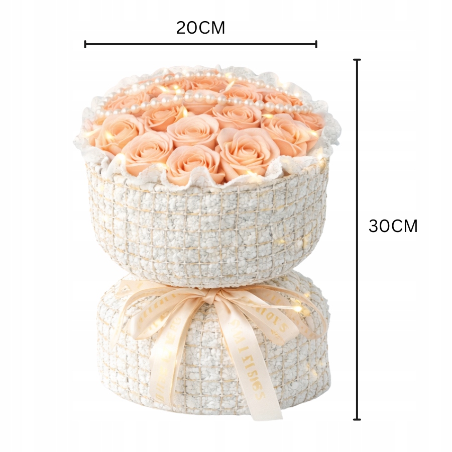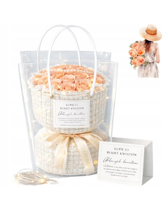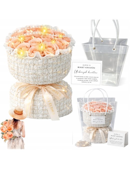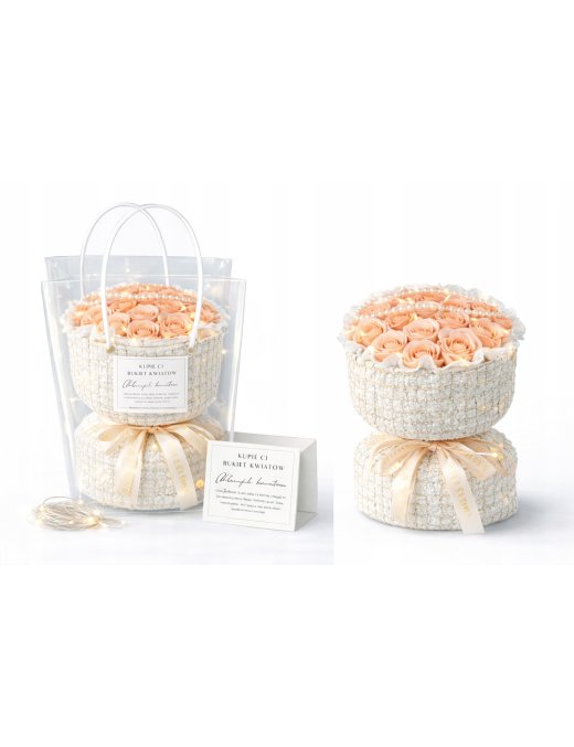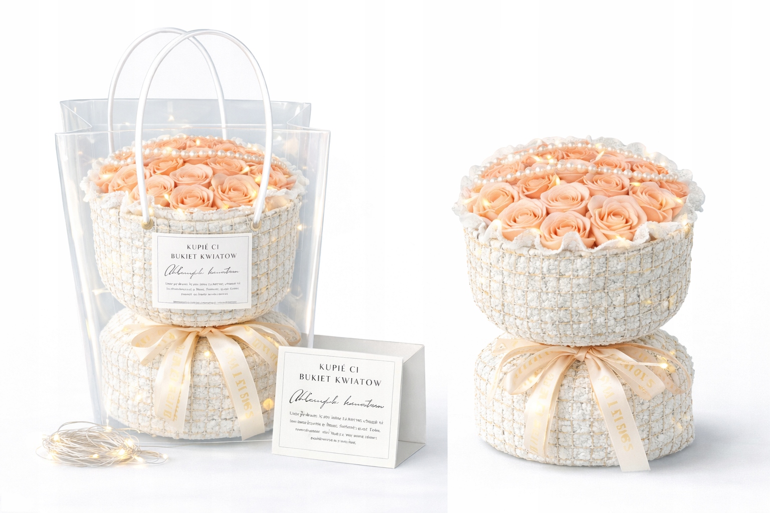 Całość została zaprojektowana w stylu premium – elegancka forma, ozdobna wstążka oraz staranne wykończenie sprawiają, że bukiet wygląda luksusowo i nowocześnie. Dodatkowo w zestawie znajduje się delikatne oświetlenie LED na cienkim druciku, które subtelnie podkreśla kompozycję i tworzy wyjątkowy klimat.