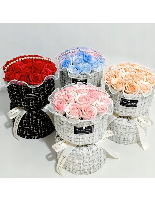 Bukiet został wykonany z wysokiej jakości róż mydlanych, które zachowują piękny wygląd przez długi czas. Dzięki temu nie więdną jak świeże kwiaty i mogą stanowić zarówno prezent, jak i dekorację wnętrza.
