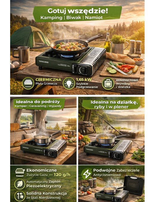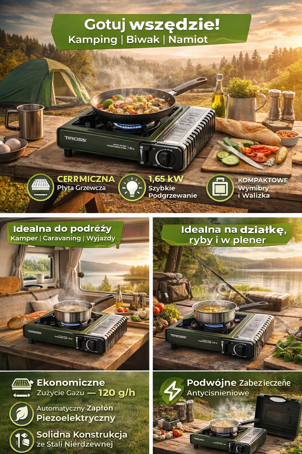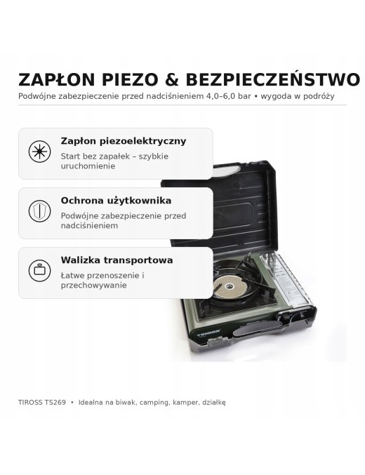 Szukasz kompaktowej kuchenki na biwak, camping, do kampera lub na działkę? TIROSS TS269 z płytą ceramiczną zapewnia równomierne ciepło, wygodny zapłon piezoelektryczny i łatwy transport dzięki walizce.