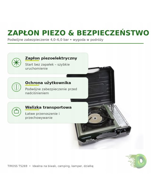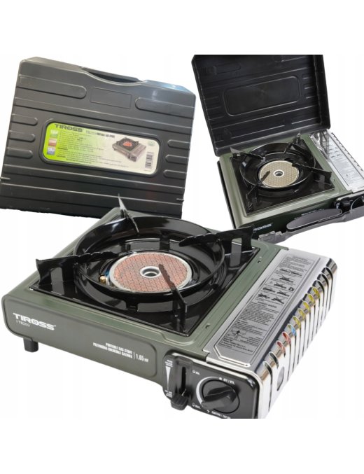 TIROSS TS269 to praktyczna kuchenka gazowa turystyczna / campingowa / biwakowa, idealna na: caravaning, namiot, ryby, działkę, wyjazdy rodzinne oraz jako awaryjna kuchenka gazowa.