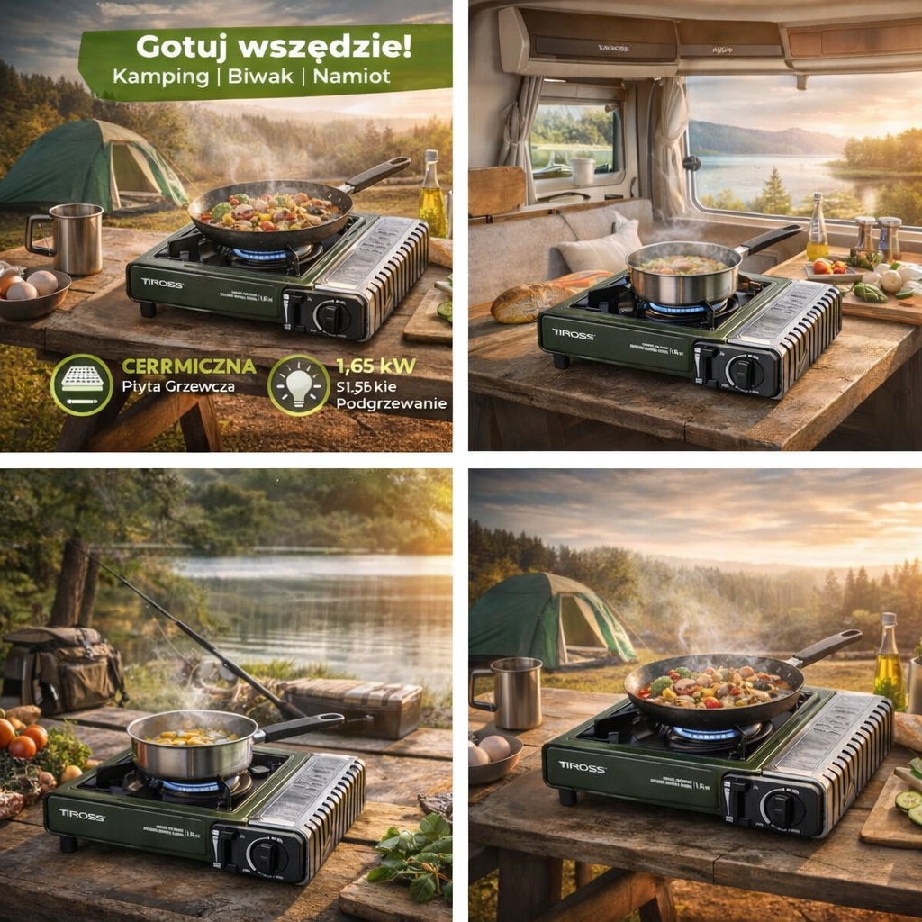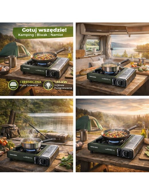 Szukasz kompaktowej kuchenki na biwak, camping, do kampera lub na działkę? TIROSS TS269 z płytą ceramiczną zapewnia równomierne ciepło, wygodny zapłon piezoelektryczny i łatwy transport dzięki walizce.