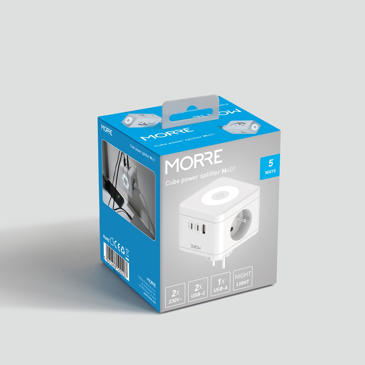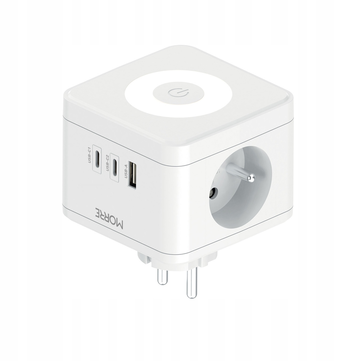 MORRE M401 Rozgałęziacz zasilania i lampa nocna to kompaktowa kostka zasilająca w ognioodpornej obudowie PC (750 °C), wyposażona w cztery gniazda AC o łącznej mocy 3680 W @ 230 V~/16 A oraz w cztery porty USB (2× USB‑A 5 V/2,4 A 12 W i 2× USB‑C 5 V/2,4 A 12 W – łączne wyjście USB: 5 V/2,4 A MAX 12 W) obsługujące protokoły DCP, Samsung i Apple; kostka posiada centralny wyłącznik z niebieską diodą LED, ochronne drzwiczki i wbudowaną lampkę nocną z trzystopniową regulacją jasności, a jej bezpieczeństwo zapewnia chip LN4050 z zabezpieczeniami przed przeciążeniem, zwarciem i przegrzaniem. Działa w temperaturach od –5 °C do 40 °C i posiada certyfikaty CE oraz RoHS.