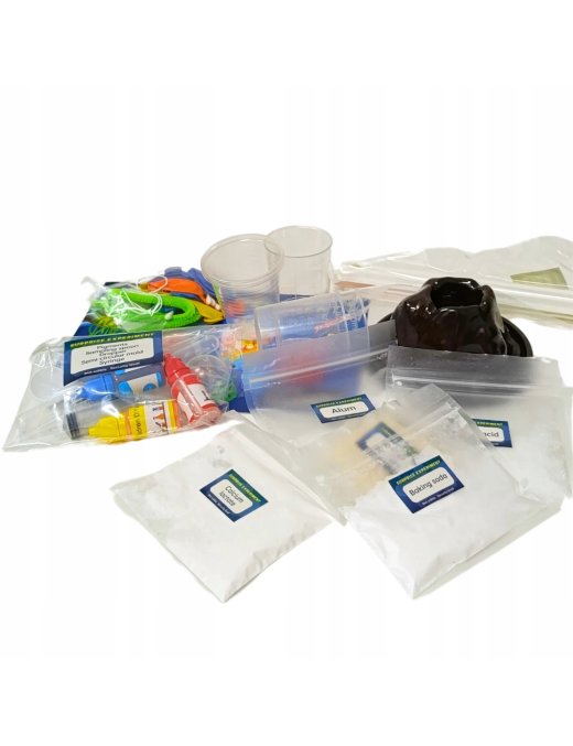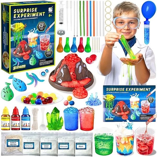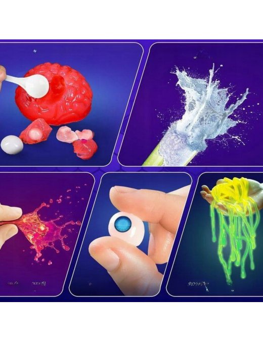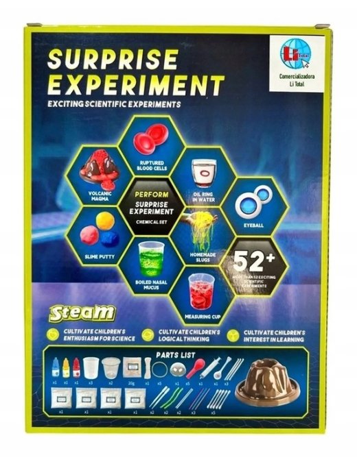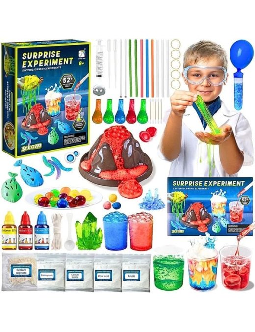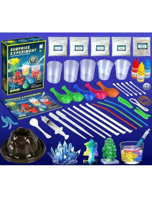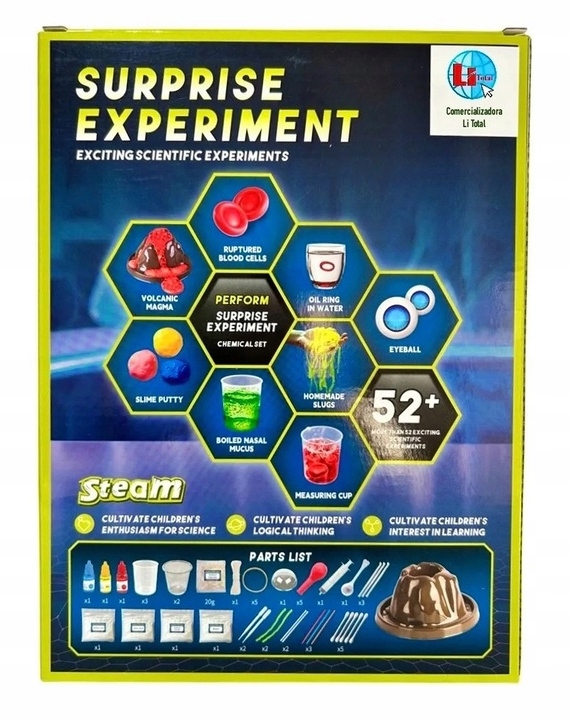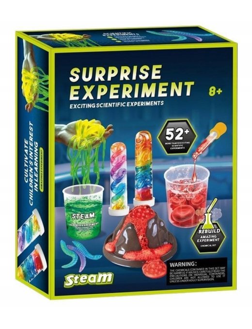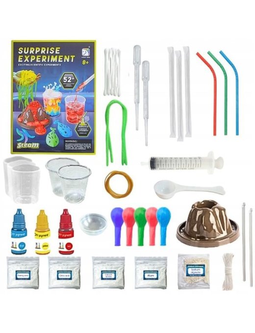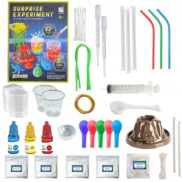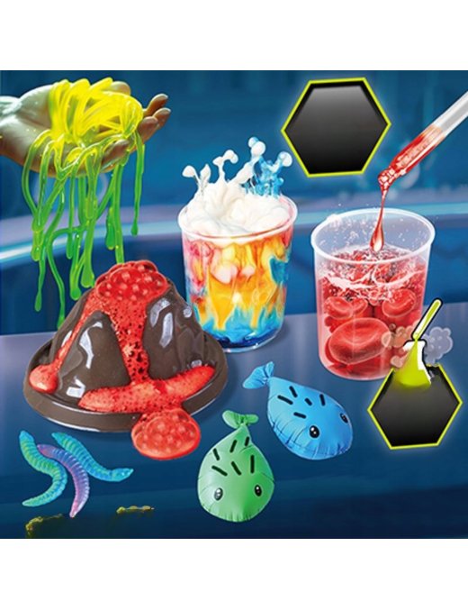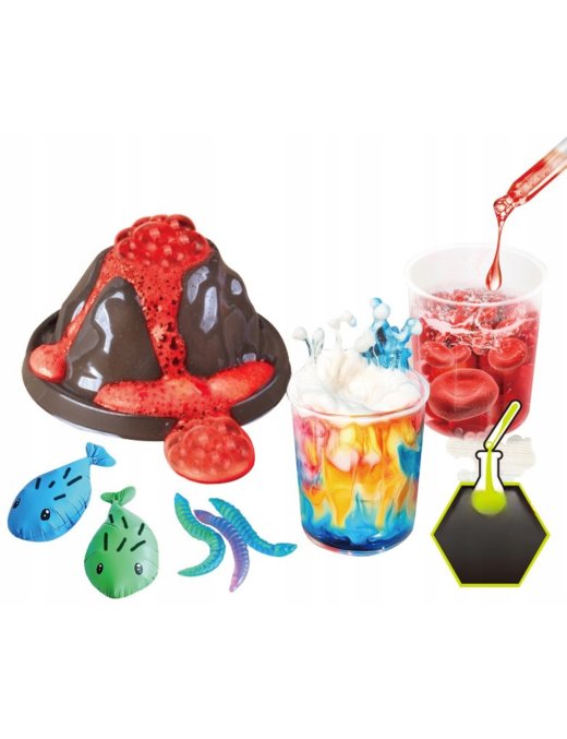 Zawiera aż 52 różnorodne eksperymenty, w tym wybuch wulkanu, świecące bałwany, bulgoczące gejzery i kolorowe wodospady, które umożliwiają młodym naukowcom, naukę korzystania z profesjonalnych akcesoriów chemicznych, takich jak probówki, szklanki, pipety i wiele innych.