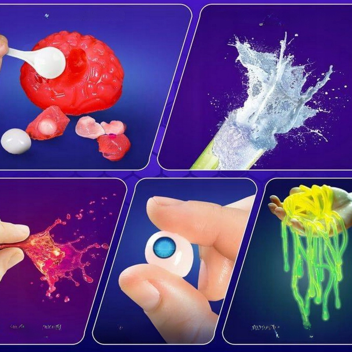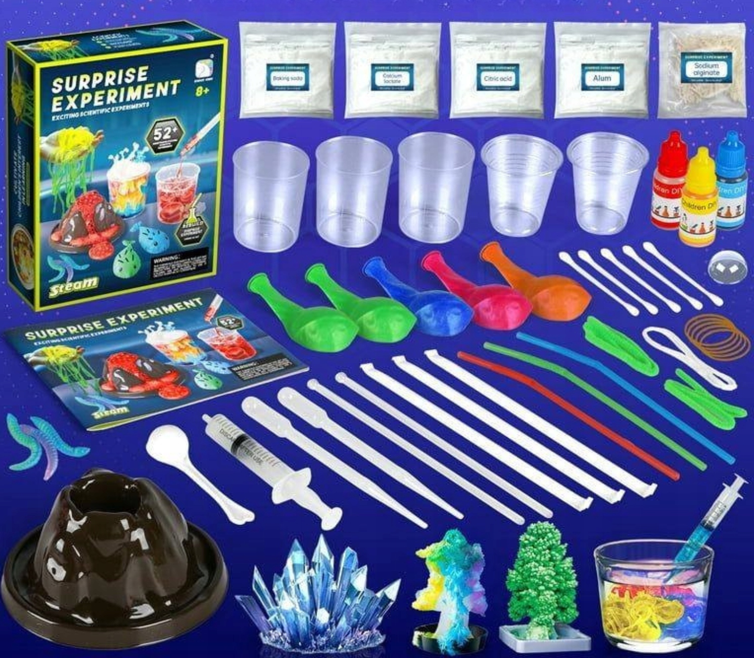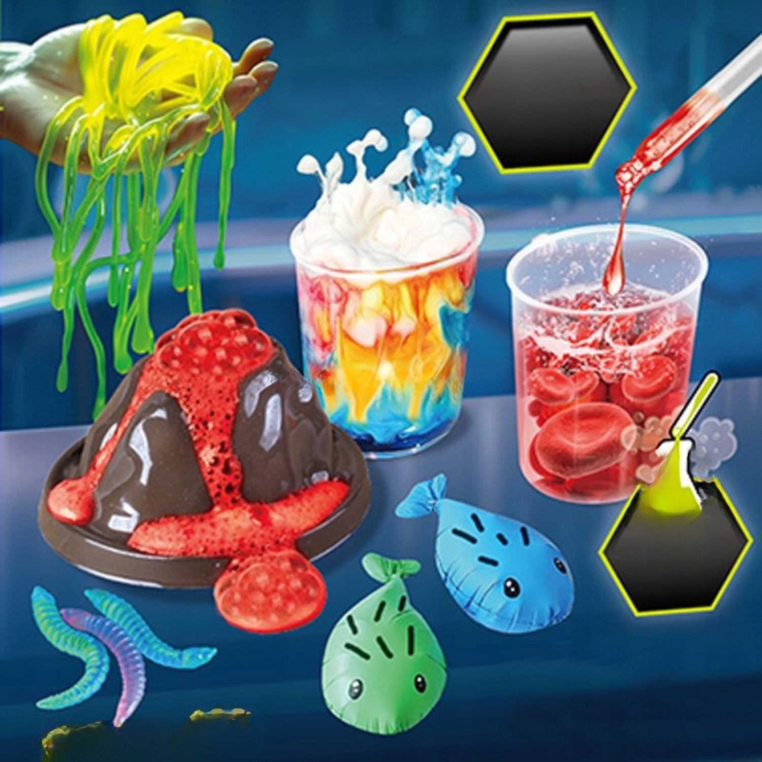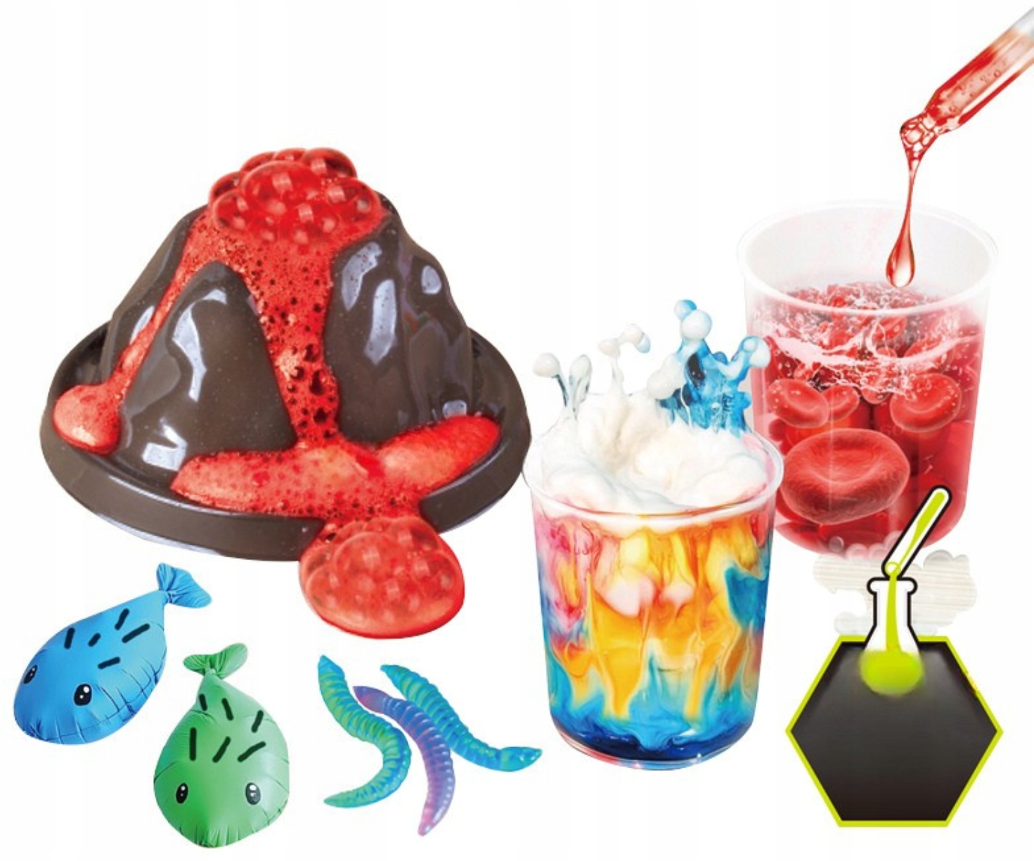 Zawiera aż 52 różnorodne eksperymenty, w tym wybuch wulkanu, świecące bałwany, bulgoczące gejzery i kolorowe wodospady, które umożliwiają młodym naukowcom, naukę korzystania z profesjonalnych akcesoriów chemicznych, takich jak probówki, szklanki, pipety i wiele innych.