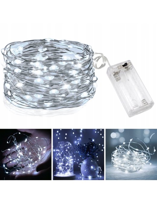 LAMPKI LED DRUCIKI 5 METRÓW 50 LED NA BATERIE MIKRO ŚWIATEŁKA ZIMNY BIAŁY